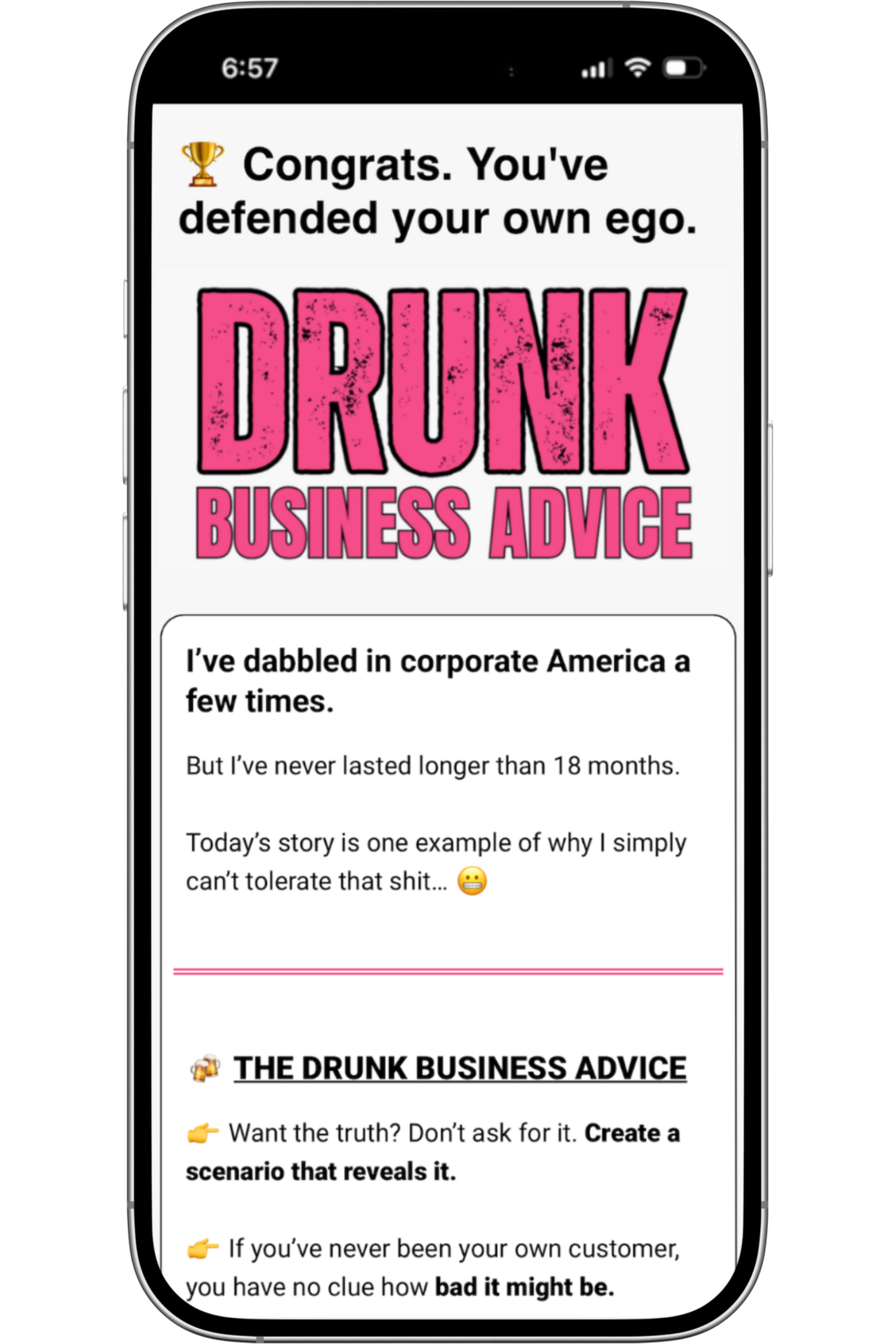 Now I write Drunk Business Advice to help you build sharper judgement and stronger boundaries. And since I use humor as a defense mechanism, you’ll LMAO through every issue — guaranteed.
